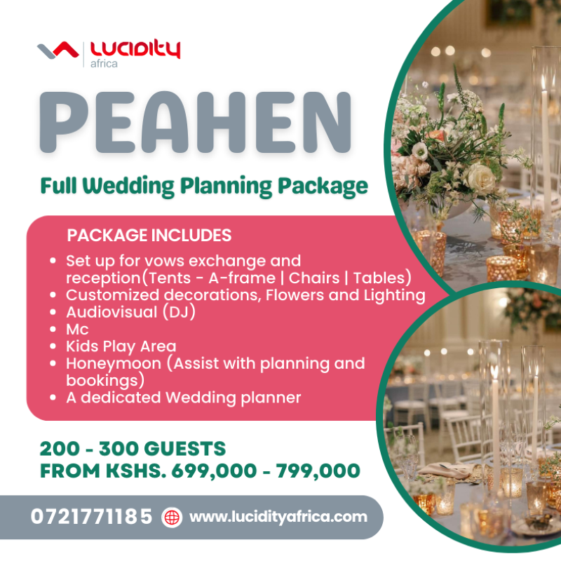 | Peahen Wedding — 200 guests | Couples who want a full luxury experience with bespoke touches | Kshs 699,000 |