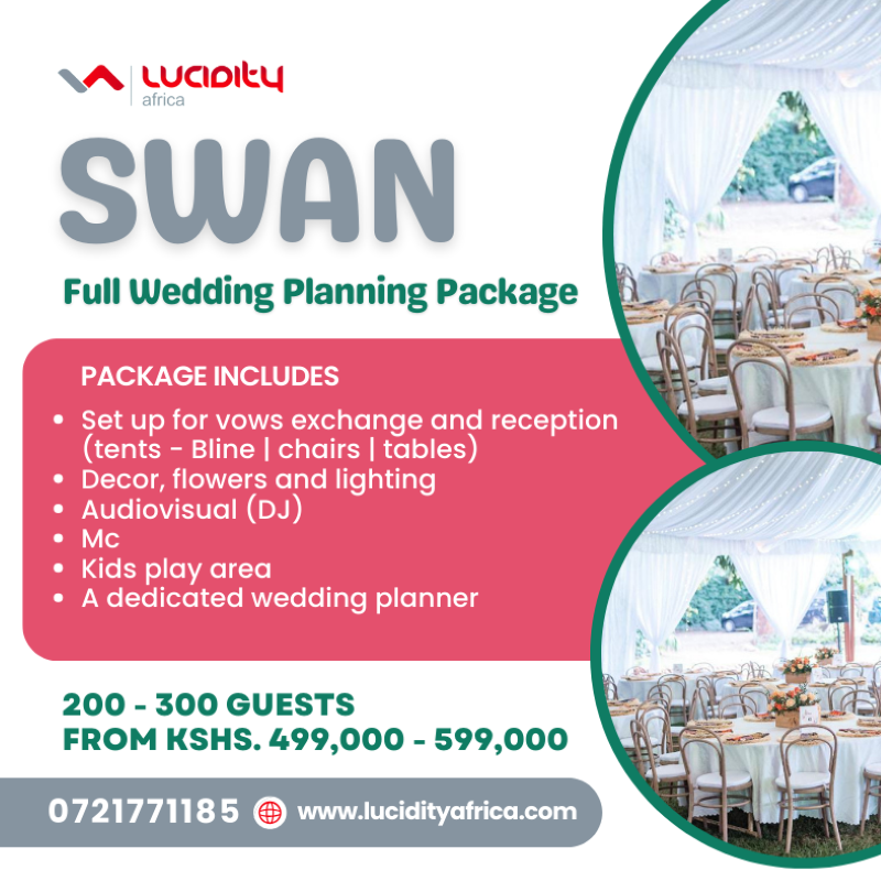 | Swan Wedding — 200 guests | Couples who want refined styling and a more premium feel | Kshs 499,000 |