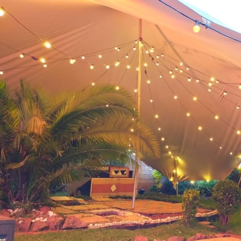 Two identical sets of furniture were positioned under the shade of the tree, each one a complete African themed lounge vignette in its own right. Branded recycled wood tables sat at the centre, surrounded by a mix of furniture and table adornments that brought warmth and personality without crowding the space. Festoon lights were strung across the interior of the stretch tent, giving the main event space a glow that held its own against the Nairobi evening.