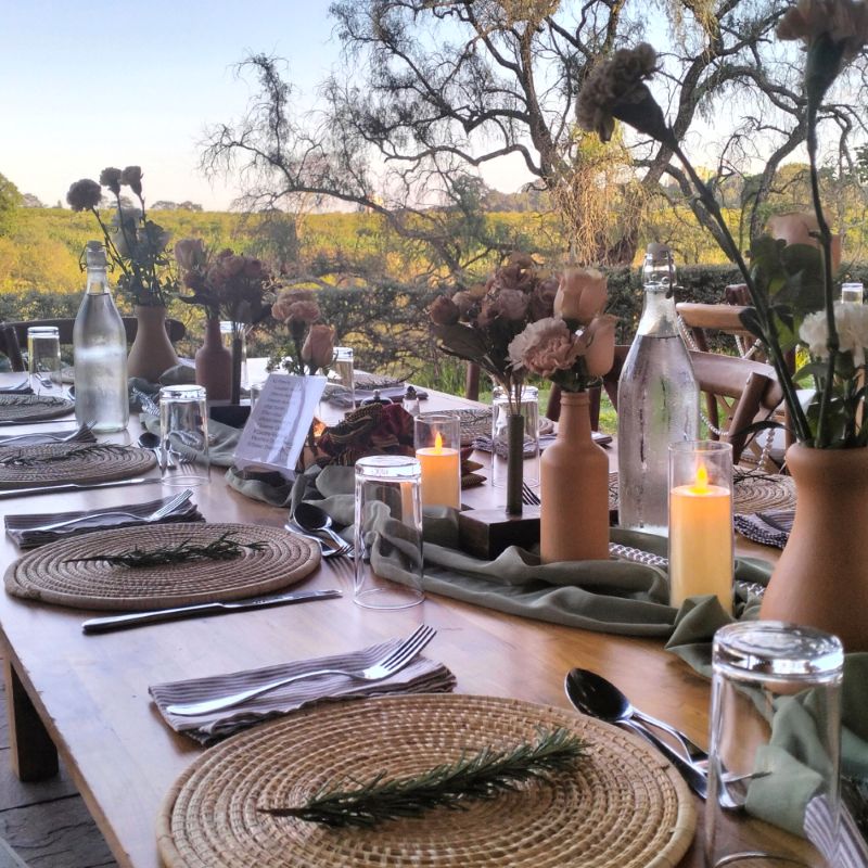 Tan striped napkins brought a casual elegance to each place setting, paired with assorted vases filled with a mix of dried and fresh blooms in burnt orange, dusty rose, and muted greens. No two centrepieces were identical. That intentional variety made the room feel curated rather than catered.