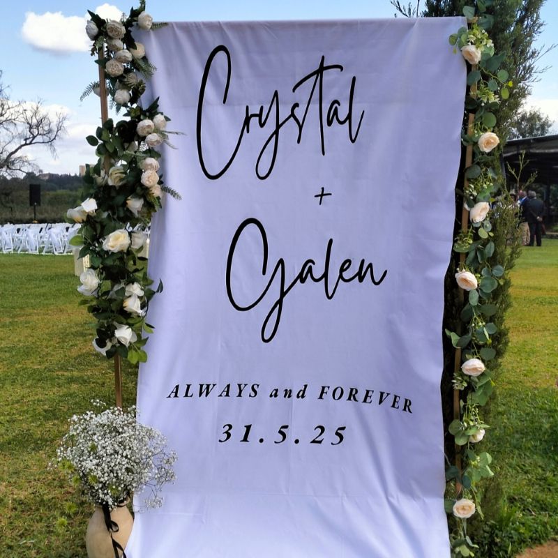 Custom white fabric welcome sign designed to Crystal and Galen’s brief.
