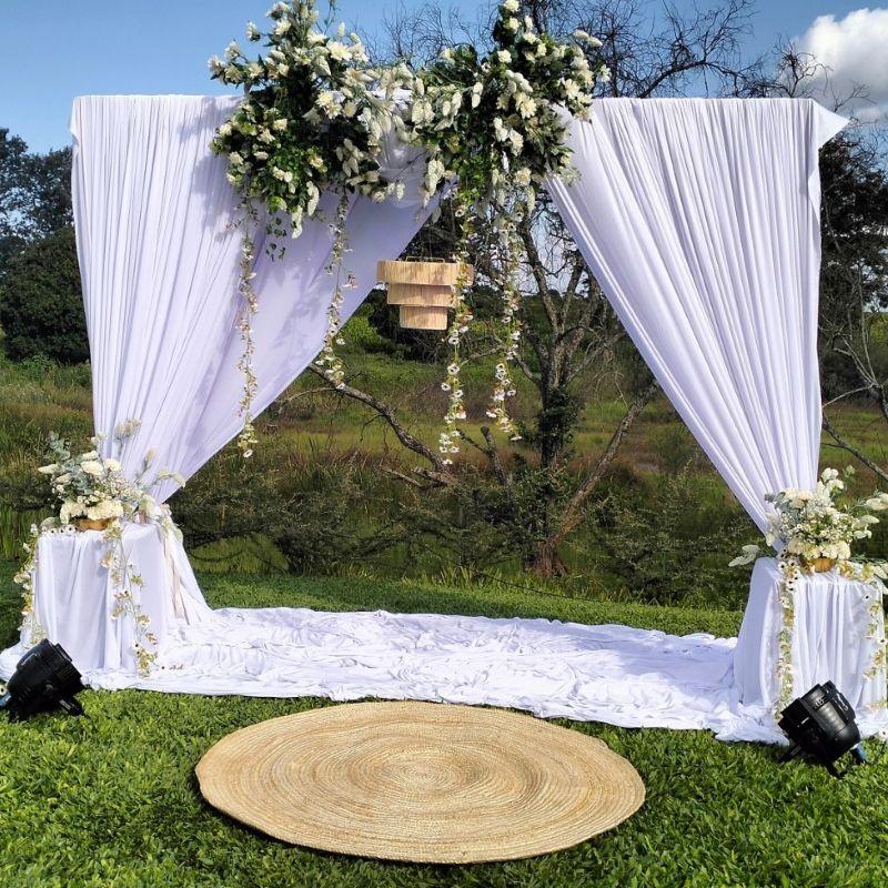 The ceremony arch held firm despite a persistent gale all afternoon. Soft white fabric and faux florals against open green lawn.